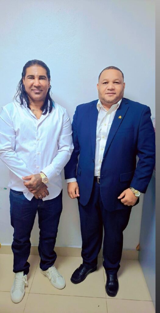 En una reciente visita al Palacio de la Policía Nacional, el exponente de la música urbana Omega El Fuerte fue recibido por el oficial investigador Bili Porquín Sánchez, quien representó a la comandante de la unidad de trata de personas, Francia Hernández.